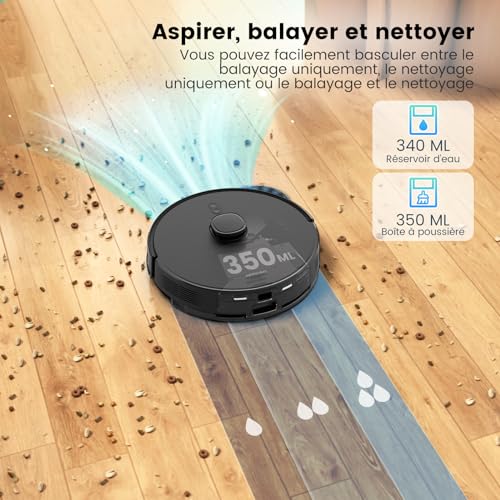 • 【Balayage, Nettoyage et Aspiration 3 en 1】L’robot aspirateur laveur AIRROBO T20+ dispose d’un bac à poussière 2 en 1 (340 ml) et d’un réservoir d’eau (350 ml). Cet aspirateur robot multifonction aux performances de qualité répondra à vos différents besoins pour les tâches ménagères quotidiennes, balayage, aspiration et serpillière, facilement à changer.