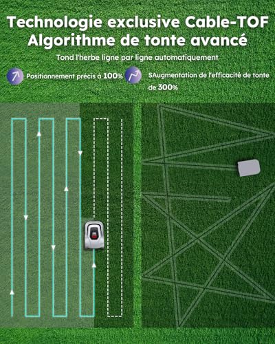 【Reprise de Tonte Automatique】La technologie Cable-ToF offre une capacité de repositionnement avancée. Même si le câble est coupé, si le robot retourne à la station de recharge, ou s’il est déplacé, il assure une tonte continue sans laisser de zones non couvertes.