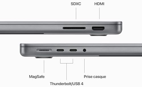 • CONNECTEZ CE QUE VOUS VOULEZ – Ce MacBook Pro offre un port de charge MagSafe, deux ports Thunderbolt/USB 4, un lecteur de carte SDXC, un port HDMI et une prise casque. Et avec le Wi‑Fi 6E et le Bluetooth 5.3, vous profitez d’une connectivité sans fil parfaitement fluide. Prise en charge d’un écran externe. (Wi‑Fi 6E disponible dans les pays et les régions le prenant en charge.)
