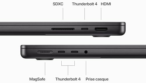 - CONNECTEZ CE QUE VOUS VOULEZ – Ce MacBook Pro offre un port de charge MagSafe, trois ports Thunderbolt 4, un lecteur de carte SDXC, un port HDMI et une prise casque. Et avec le Wi‑Fi 6E et le Bluetooth 5.3, vous profitez d’une connectivité sans fil parfaitement fluide. Et vous pouvez connecter jusqu’à deux écrans externes avec la M3 Pro et jusqu’à quatre avec la M3 Max. (Wi‑Fi 6E disponible dans les pays et les régions le prenant en charge.)