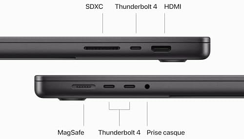 CONNECTEZ CE QUE VOUS VOULEZ – Ce MacBook Pro offre un port de charge MagSafe, trois ports Thunderbolt 4, un lecteur de carte SDXC, un port HDMI et une prise casque. Et avec le Wi‑Fi 6E et le Bluetooth 5.3, vous profitez d’une connectivité sans fil parfaitement fluide. Et vous pouvez connecter jusqu’à deux écrans externes avec la M3 Pro et jusqu’à quatre avec la M3 Max. (Wi‑Fi 6E disponible dans les pays et les régions le prenant en charge.)