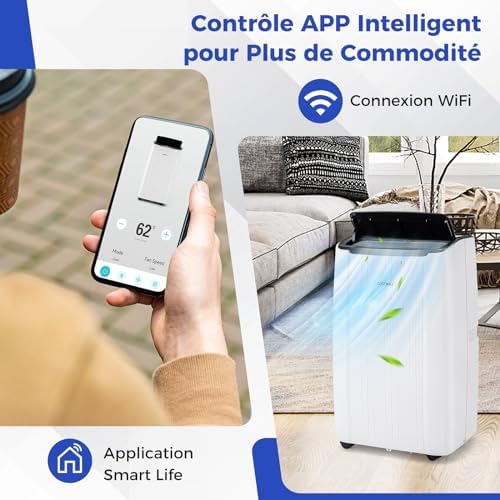 【6 EN 1 – Confort Toute Saison】6 Modes : Refroidissement (12000 BTU), Chauffage (9500 BTU), Ventilateur (3 vitesses, 400m³/h), Déshumidification (29L/jour), Mode de nuit, Mode Automatique (Changer automatiquement de mode en fonction de la température ambiante).