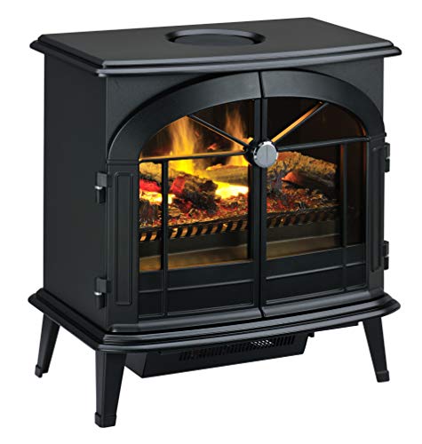 STYLE TRADITIONNEL: Cheminée électrique au look authentique de poêle en fonte avec boîtier métallique et effet flamme breveté Optimyst, feu à base de vapeur d’eau froide