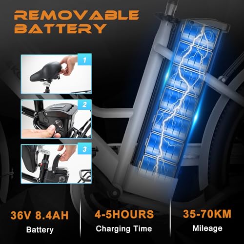 • Mode de conduite: Vous pouvez choisir entre deux modes de conduite, le mode normal et le mode booster. Le vélo est équipé d’un moteur de 36V 250W, qui fournit suffisamment de puissance pour vos déplacements. La vitesse maximale est de 25KM/H, et la batterie complètement chargée peut parcourir 35-70KM