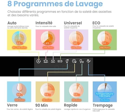 [Fonctionnement intuitif et affichage anti-empreintes digitales] Profitez d’une manière simple et intuitive de laver votre vaisselle grâce à l’affichage numérique et aux icônes simples. Vous pouvez voir le temps restant, les réglages et la progression du programme en un coup d’œil. De plus, étant en acier inoxydable, l’extérieur est facile à nettoyer et ne marque ni les empreintes digitales ni les taches.