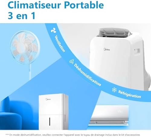 MIDEA Climatiseur Mobile Silencieux 12000 BTU avec Évacuation – Climatisation Portable Prêt à Poser 3500W – Clim Réversible Split Mobile – 3 Vitesses avec Kit de Fenêtre et…